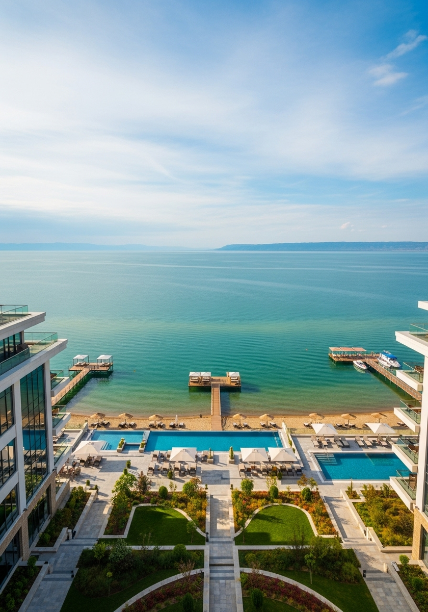 Инфраструктура включает основные удобства для комфортного проживания и отдыха. Расположение вблизи озера обеспечивает легкий доступ к водным развлечениям и пляжному отдыху.
