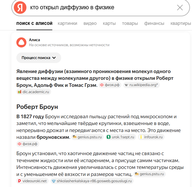 Тот самый случай, когда на вопрос "кто" можно ответить "Дед Пихто". И я, как учитель, такой ответ засчитаю. В начале курса физики 7 класса проходят основы строения вещества, атомы и молекулы. Учебник физики подробно рассказывает о самых ярких явлениях, доказывающих движение молекул: о броуновском движении и диффузии. Говорится об английском ботанике Роберте Броуне, который однажды случайно обнаружил хаотическое движение пыльцы растений. Приводится история теоретических исследований Эйнштейна и Смолуховского. Также рассказывается о явлении диффузии, которое встречается в нашей жизни повсеместно: от соленых огурцов до нанотехнологий. Зададим же школьникам вопрос "Кто открыл явление диффузии?" Тем, кто привык "гуглить" или "яндексить", умные нейросети выдадут вот что: Итак, Яндекс по первому запросу выдает Броуна. Это, очевидно, полностью неправильно. Нейросеть можно понять: диффузия и броуновское движение почти на одной странице учебника. Гугл более осторожен: Броуна не выдает. Если и