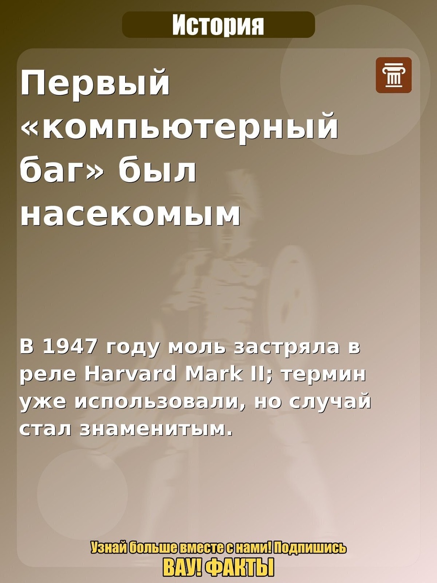 Первый «компьютерный баг» был насекомым. В 1947 году моль застряла в реле Harvard Mark II; термин уже использовали, но случай стал знаменитым. Интересный факт по теме «История»: Первый «компьютерный баг» был насекомым. Почему так: В 1947 году моль застряла в реле Harvard Mark II; термин уже использовали, но случай стал знаменитым.. Поделитесь в комментариях, знали ли вы об этом и стоит ли делать продолжение по теме. #история #факты #удивительно