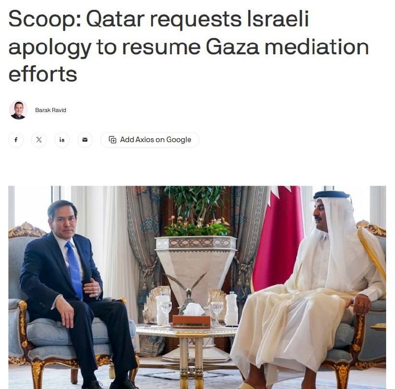 Израиль недооценил масштаб кризиса, вызванный ударами по Дохе, премьер страны Нетаньяху осознает, что он просчитался, — Axios. Кроме того, по данным издания, Катар требует от Израиля извинений за атаку на Доху, прежде чем вернётся к посредничеству в урегулировании ситуации в Газе.