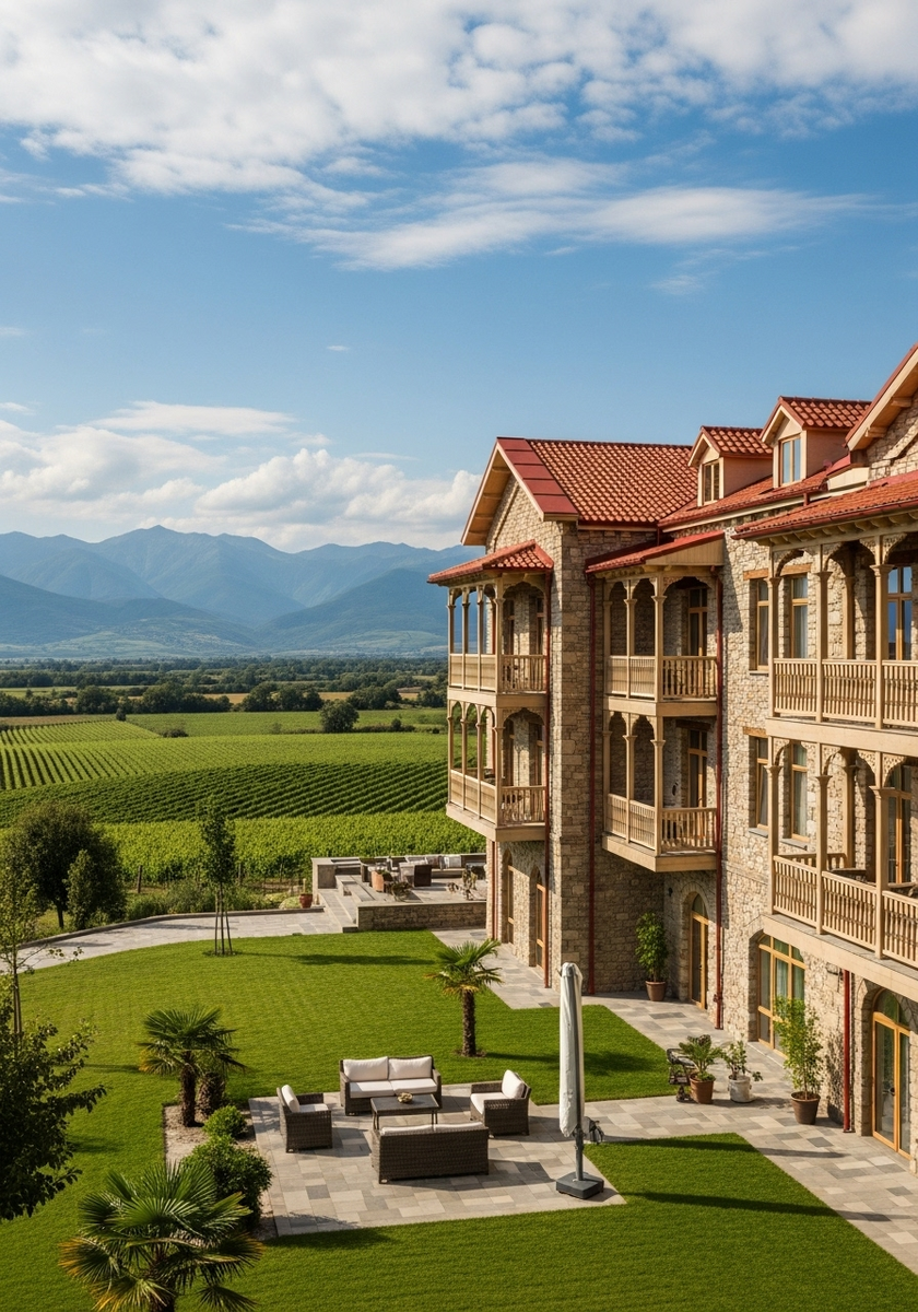 Элегантный винный отель-шато с собственными виноградниками, расположенный в Телави среди живописной Алазанской долины. Отель построен в стиле французского шато и окружен 450 гектарами виноградников, откуда открываются захватывающие виды на Кавказские горы.