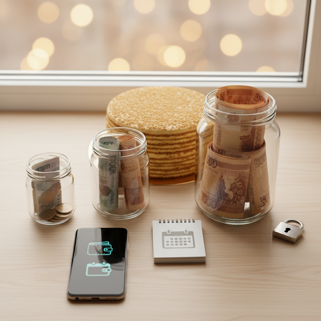 Отдельный маленький «конверт»: кладём понемногу каждый месяц, чтобы не искать крупную сумму разом. Наличные — «на неделю».