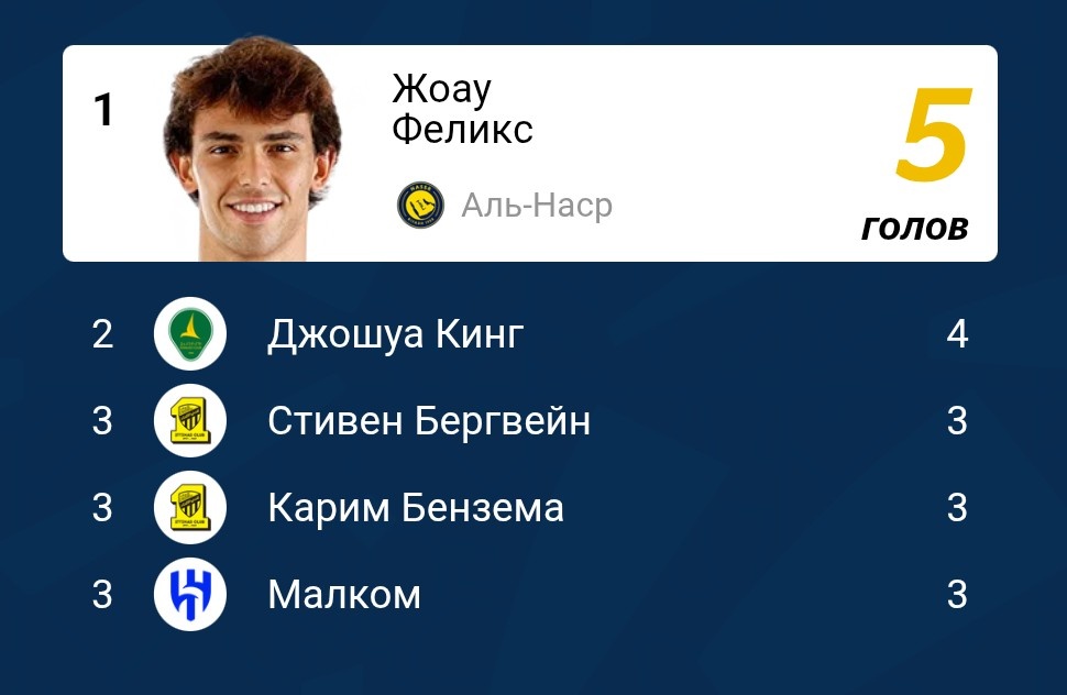 Жоау Феликс начал свой первый сезон в Саудовской Про-лиге ярко — настолько, что о нём уже говорят как о главной ударной силе «Аль-Насра». В третьем туре против «Аль-Рияда» португальский форвард забил два мяча, доведя свой счет до пяти голов всего за три игры. Стоит вспомнить старт сезона: в первом туре Феликс оформил хет-трик в матче с «Аль-Таавуном» (5:0), и с тех пор его имя стало синонимом опасности для ворот соперников. Теперь, после дубля против «Аль-Рияда», он уверенно возглавил гонку бомбардиров. Ближайшим преследователем Феликса стал Джошуа Кинг из «Аль-Халиджа» с четырьмя голами, но португалец явно на шаг впереди. Его игра впечатляет не только результативностью, но и умением создавать моменты, открываться в нужных зонах и мгновенно реагировать на ошибки защитников. С таким стартом складывается ощущение, что Феликс быстро адаптировался к Саудовской Аравии и сразу стал лидером команды. «Аль-Наср» теперь получает от него максимум — и нападение клуба, и болельщики уже видят в