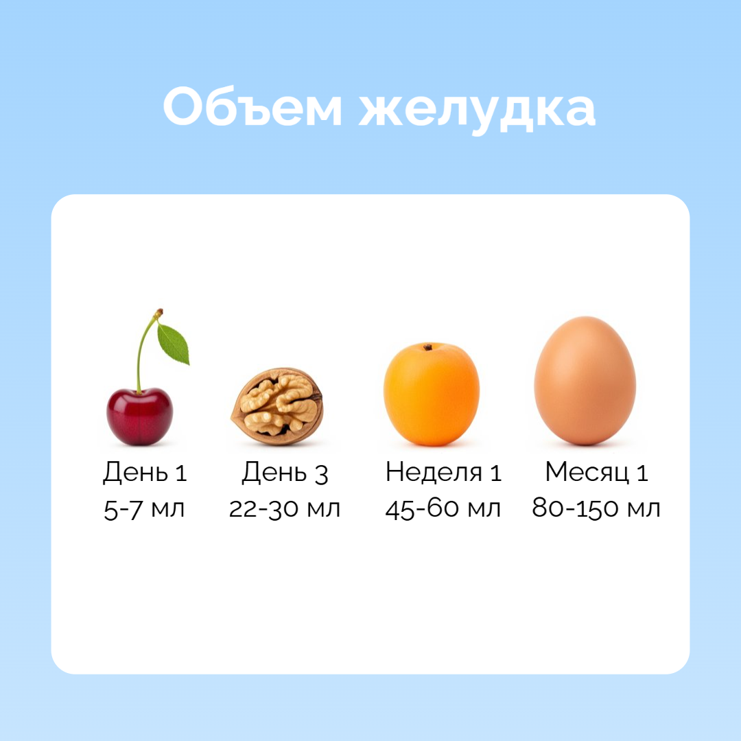 К 3-му дню желудок вырастает до размера грецкого ореха (22-30 мл