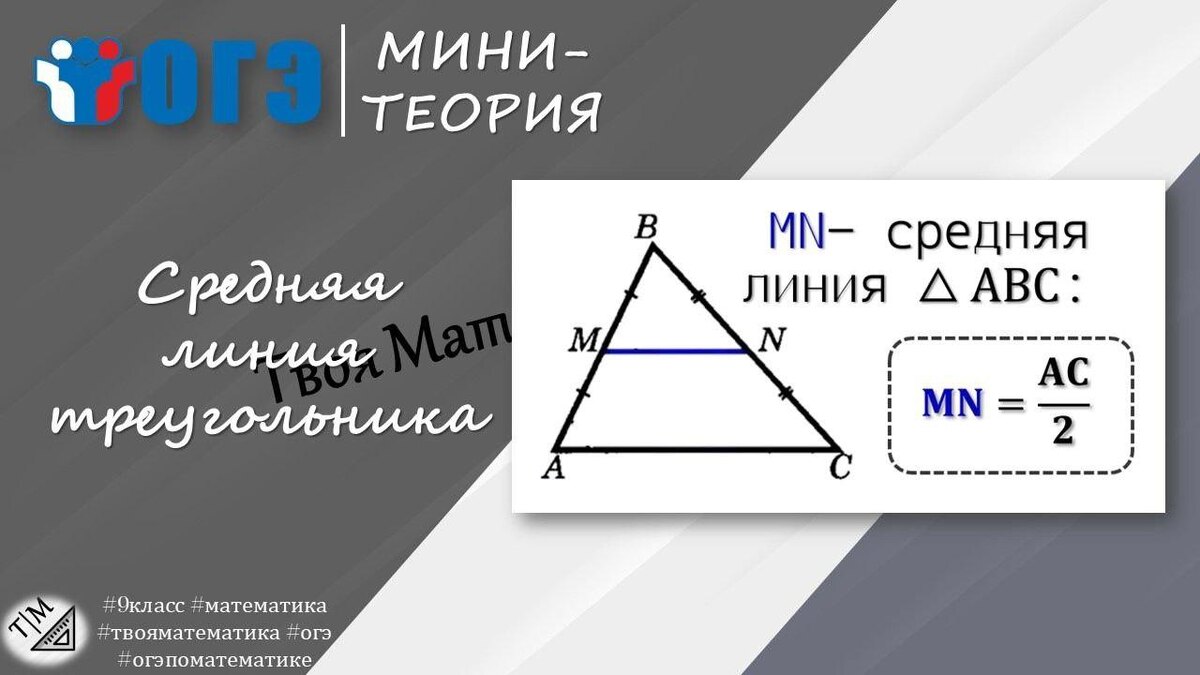 ✂️#твояминитеория 📎Определение средней линии треугольника. Средняя линия треугольника – это отрезок, соединяющий середины двух сторон треугольника. Этот отрезок играет важную роль в геометрии треугольника и имеет несколько ключевых свойств. 📎Теорема о средней линии треугольника. Одно из главных свойств средней линии треугольника заключается в том, что она параллельна одной из сторон треугольника и равна её половине. Это значит, что если у нас есть треугольник ABC, и мы проводим среднюю линию, соединяющую середины сторон AB и AC, то эта линия будет параллельна стороне BC и равна её половине. 🍀💯Подготовка к ОГЭ по математике включает в себя изучение множества тем, и средняя линия треугольника – одна из них. Помните основные теоремы и свойства, тренируйтесь в решении задач, и вы обязательно справитесь с этим заданием на экзамене. Удачи вам в подготовке и на самом экзамене! Твой вектор в мир математики! #9класс #математика #средняялиния #твояматематика #огэ #огэпоматематике #огэмат
