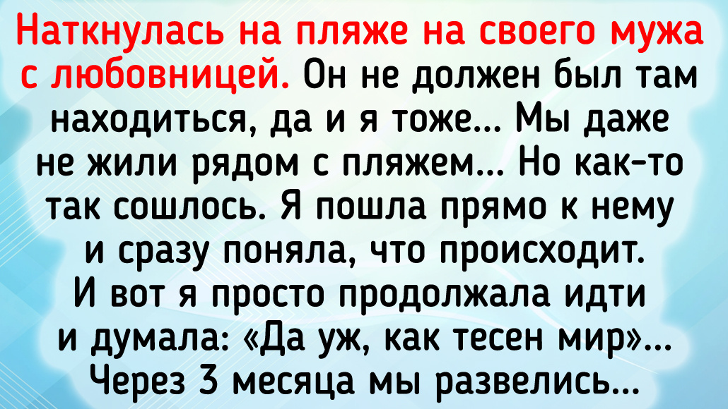 - Наткнулась на пляже на своего мужа с любовницей. Он не должен был там находиться, да и я тоже. Мы даже не жили рядом с пляжем... Но как-то так сошлось. Я пошла прямо к нему и сразу поняла, что происходит. И вот я просто продолжала идти и думала: «Да уж, как тесен мир». Через 3 месяца мы развелись...