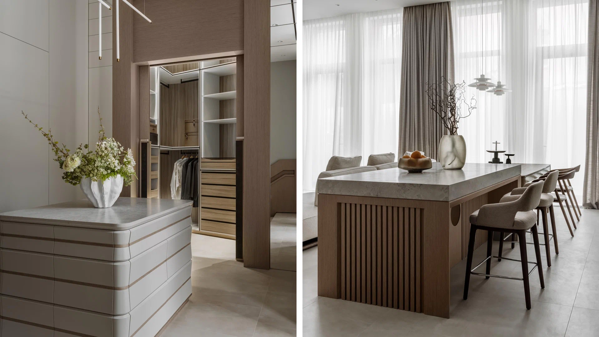 Комфортный интерьер, вдохновлённый лондонскими и нью-йоркскими таунхаусами, раскрылся в самом центре Москвы. Таунхаус от студии Koddiz в приглушённых природных тонах обладает и удобной планировкой, и подземным уровнем с выходом в паркинг. На первом этаже расположились общие пространства: кухня-гостиная с выходом в небольшое уютное патио, гардеробная, кладовка, постирочная и прихожая королевских размеров. Второй этаж — место для спален, ванны с полноценной сауной и рабочего кабинета. Интерьер вдохновлён современными элитными таунхаусами: минимализм, чистота и тихая роскошь — без обилия красок и визуального шума. Только природная палитра, геометрические формы и скрытые системы хранения, помогающие поддерживать ощущение простора. Почти вся мебель спроектирована дизайнерами и изготовлена на заказ, поэтому всё так органично сочетается между собой. Образ виллы завершают элементы декора: скульптуры Льва Ефимова, графика Даши Сурмы и абстракции Кирилла Басалаева. Фотографии: Ольга Шангина / my