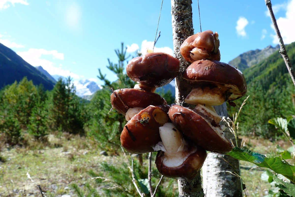 Наконец дошли руки до грибов. На это раз мы попали в долину реки Аксаут в самую что ни на есть грибную сентябрьскую погоду. Дождь лил каждый день. Хорошо, что не с утра до ночи, а в основном во второй половине дня. Это позволило нам не только хорошо прогуляться по окрестным красотам (озеро Кынгырчат, водопады на реке Худюк, озеро Баймирзакель, перевал Алибек, озеро и перевал Халега, Красная горка и Марухский ледник). Но и с головой уйти в грибную охоту. Благо грибов было просто валом. Почти весь грибной справочник под ногами. Всевозможные сыроежки, особенно аметистовые, рыжики, говорушки, рядовки серые и фиолетовые, зонтики пестрые большие, подберезовики, подосиновики, грибная капуста, краснокнижные ежевики альпийские и ежевики выемчатые, мицены, лаковицы, строфарии, грузди, летние опята, чешуйчатки, мегаколибии, разнообразные трутовики и прочая, прочая, прочая. Часть из перечисленных здесь мною грибов несъедобны или ядовиты. Но больше всего насобирали маслят и осенних опят, котор