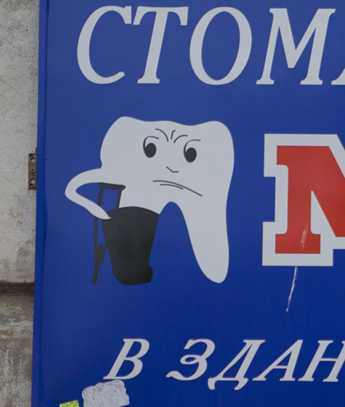 У всех стоматологов стран соцлагеря есть тайный порок - им нравится изображение зуба. Они думают, что зуб - это удачный и узнаваемый образ. Иначе ничем нельзя объяснить такое широкое распространение образа зуба в стоматологической рекламе. Иногда кажется, что зуб победил улыбку в неформальном рейтинге дебильных стоматологических образов. Но первое место - без колебаний - мы отдадим зубу из Благовещенска. Встречайте!