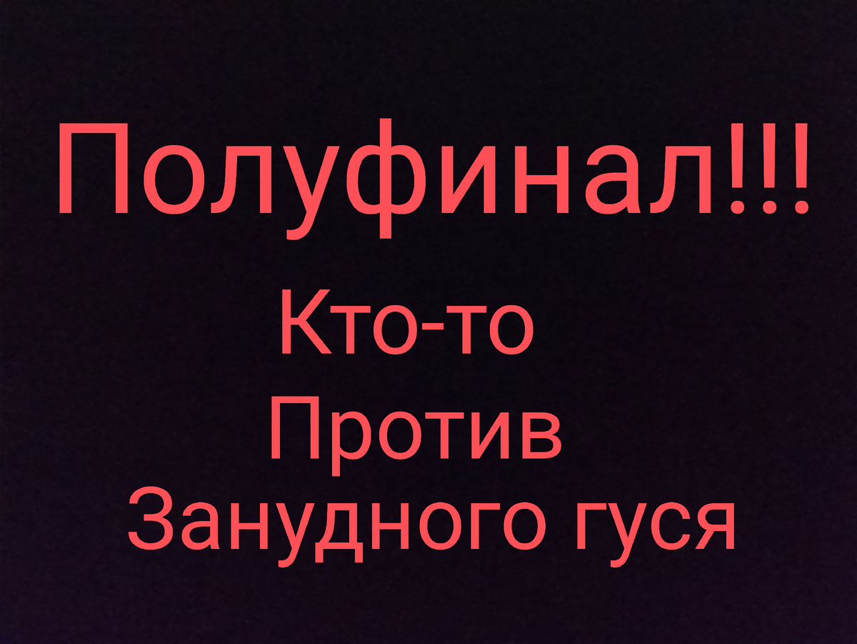 Всем привет ребята меня зовут Колокс и это полуфинал 1 сезона битвы дзенеров!!! Дошли до полуфинала только 4 дзенера: Кто-то, Зануда гусь, Мишка Фредди и Gorilla Geek!!! И так сегодня на арене сразятся Кто-то против Занудного гуся!!! Кто-то и Зануда гусь выходят на арену!!! Все зрители ждут начало битвы и она начинается!!! Зануда гусь сразу использовал злодейки смех и оглушил противника, а также позволил его на пол. Кто-то сразу использовал регенерацию и встал!!! Зануда гусь ударил его электричеством, но Кто-то опять использовал регенерацию. Да ёлкин кот возмутился Зануда гусь. Кто-то достал свою катану и попытался ударить Занудного гуся, но Зануда гусь телепортировался. Зануда сразу после этого ударил его током и использовал злодейский смех!!! Кто-то упал на пол и был без сознания!!! Зануда гусь опять ударил его электричеством и Кто-то умер!!! Зануда гусь проходит в финал!!! Да кста у Зануды теперь 30 монет, а не 20!!! Финал уже близко!!! Мы уже знаем первого финалиста!!! Кто же б