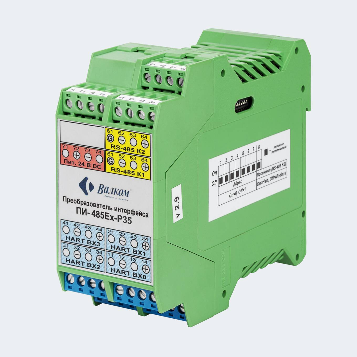 Коротко об этом преобразователе: "Преобразователь интерфейса PI-485Ех-Р35 обеспечивает подключение и питание с гальванической развязкой до четырех измерителей или сигнализаторов TGD, TLA, UTS, UPT, UTT по протоколу HART и выдачу информации от измерителей в систему автоматики верхнего уровня по резервированной шине RS-485 ModbusRTU. Модуль PI-485Ех-Р35 также дополнительно выполняет функции барьера искрозащиты, обеспечивая взрывозащиту вида «искробезопасная электрическая цепь»." Ссылка: