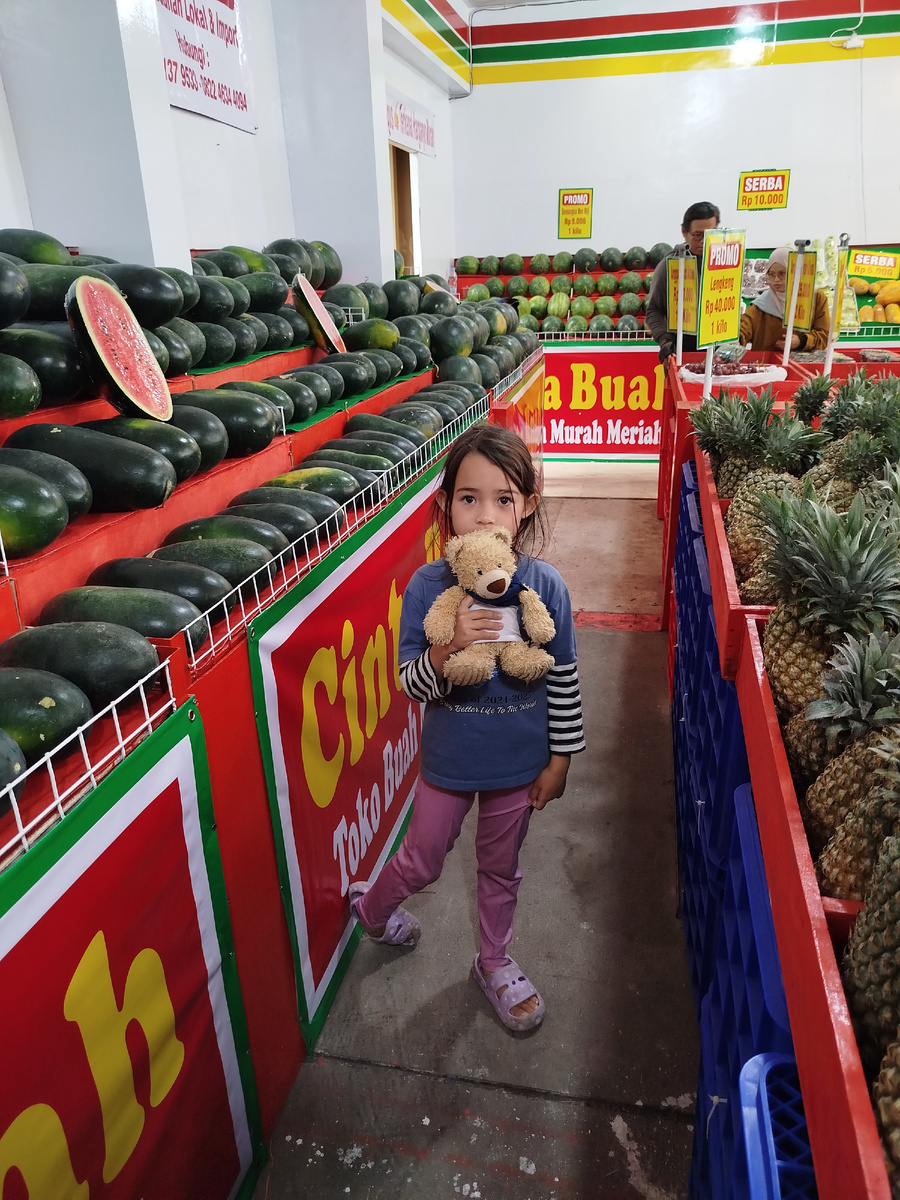 Недавно открыли новый магазин недалеко от поворота на улицу Полковника Мастури - мы несколько раз проезжали мимо. А в воскресенье учительница написала в чат, что в понедельник дети будут изучать рынок, поэтому надо принести в школу фрукты или овощи. Конечно, мы поехали в этот новый магазин. Цены оказались очень хорошими, выбор тоже. Арбузы, например, по 9000 рупий (45 рублей) килограмм - в других местах от 12000, чаще 15000. Драконий фрукт 19000 рупий за килограмм - 95 рублей, даже у бродячего продавца он стоит дороже Ананас - 10000 рупий за штуку (50 рублей) Апельсины - 30000 (150 рублей) за килограмм, тогда как везде 40000 - 45000. Взяли два белимбина, два джамбу, два яблока и один апельсин, вышло на 29000 рупий - 145 рублей. Яблоки - это экзотические фрукты, поэтому две штуки вышли на 50 рублей. Два джамбу - 35 рублей, два белимбина - 20 рублей, апельсин - 40 рублей. В школу Амира отнесла 1 джамбу, 1 белимбин и 1 яблоко. Хотела сначала отнести апельсин, но потом решила его съ