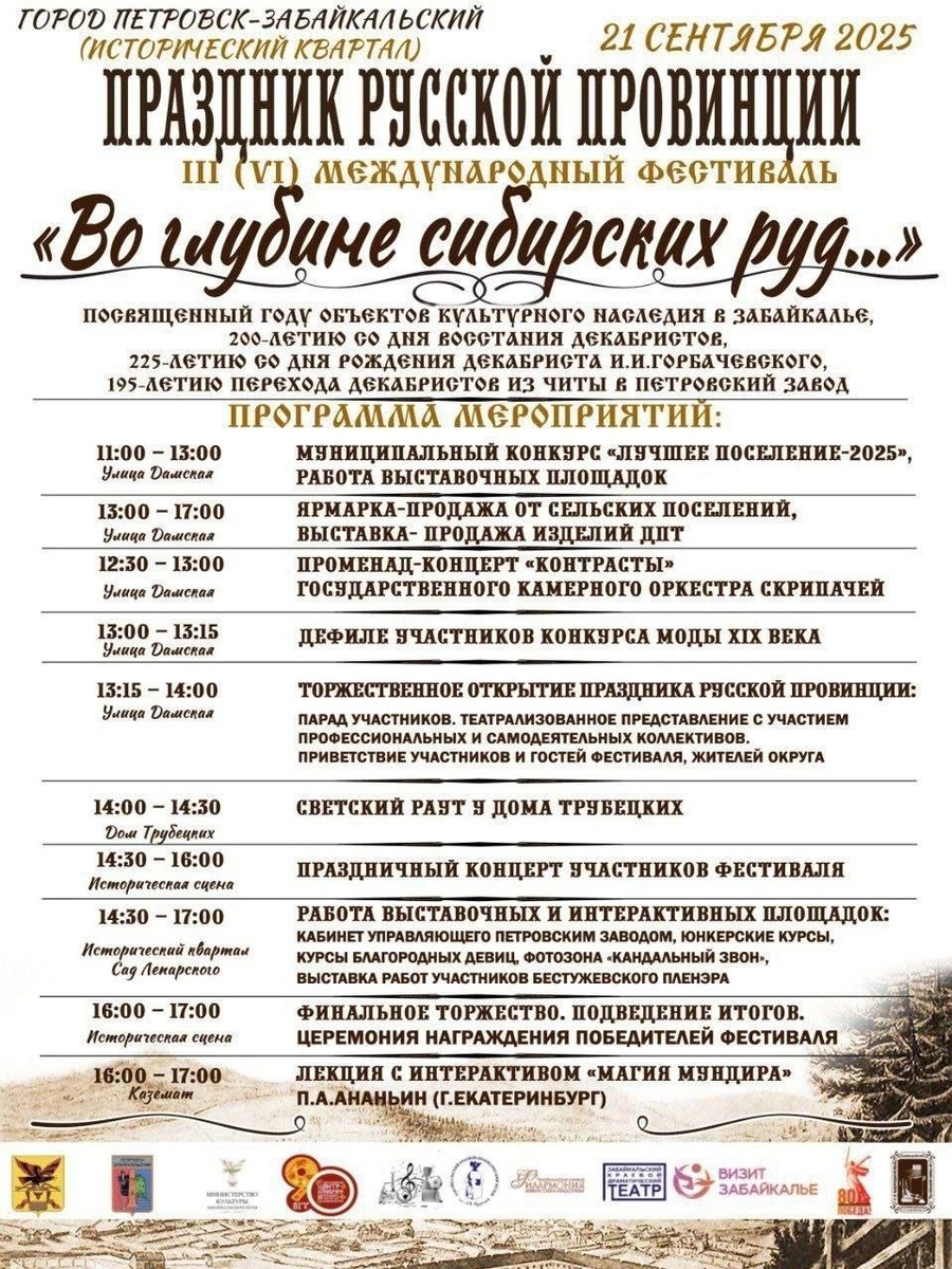 ☀️ Доброе утро, друзья! Сегодня мы вплотную приблизилась к финальному, третьему, заключительному дню самого масштабного фестиваля о декабристах в Забайкалье - «Во глубине сибирских руд…» 💥 Это грандиозное, поистине историческое событие, которое, несомненно, оставит в наших сердцах неизгладимый след и подарит море ярких, волнующих эмоций! ⏰ Ждём всех жителей и гостей города Петровска-Забайкальского в Историческом квартале на улице Дамской в 11:00! #Воглубинесибирскихруд2025