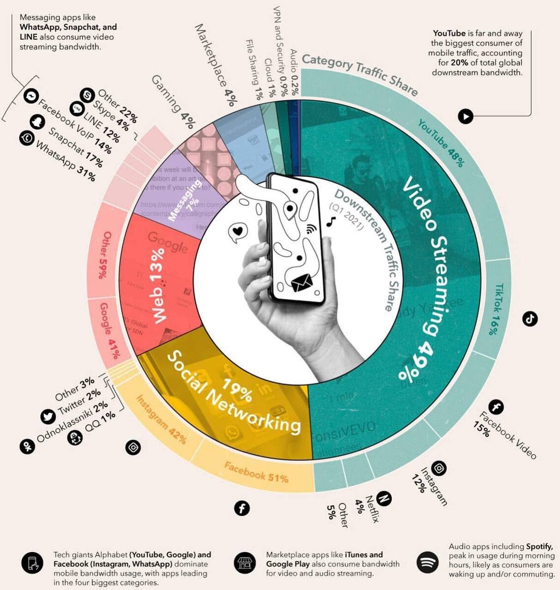 Из всех тех несметных тысяч и миллионов терабайт данных, что каждый год потребляют мобильные устройства по всему миру, почти половина (49 %) приходится на видеосервисы 48 % от этой цифры - это один лишь YouTube Почти четверть всего мобильного трафика в мире - это один сайт... TikTok отстаёт от лидера в три раза: 16 % от общего мобильного трафика в мире Это больше, чем видеосервисы Facebook и Instagram и Netflix 19 % мирового мобильного трафика приходится на соцсети: в основном Facebook и Instagram На обычный привычный нам Интернет приходится всего 13 % мирового мобильного трафика, 7 % на мессенджеры, а остальные категории набирают совсем понемногу