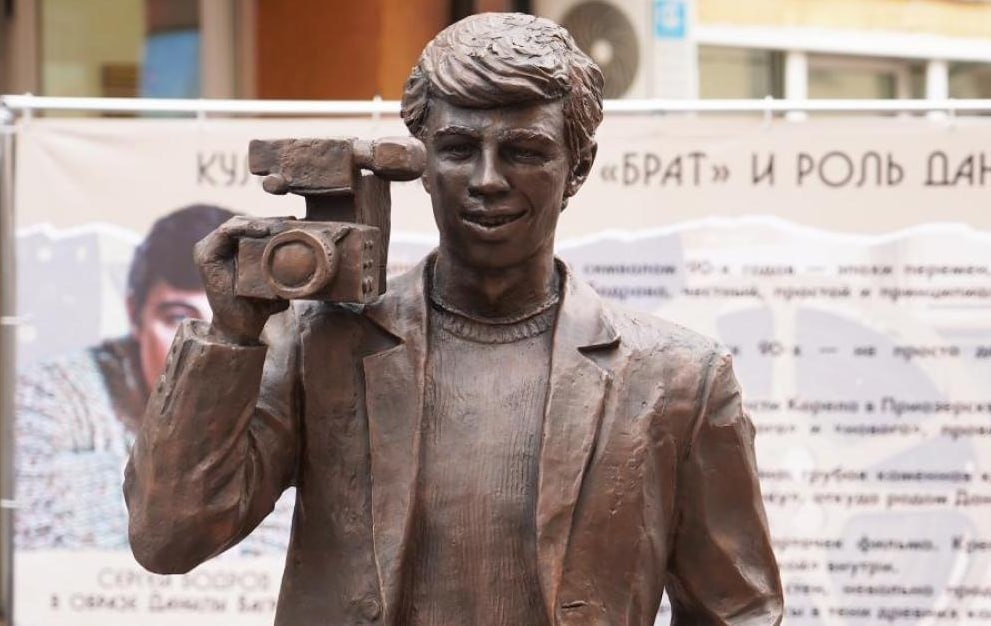 Монумент установили в родном городе главного героя фильма «Брат». На фоне фигуры Бодрова стенд с кадрами из кинокартины Балабанова.