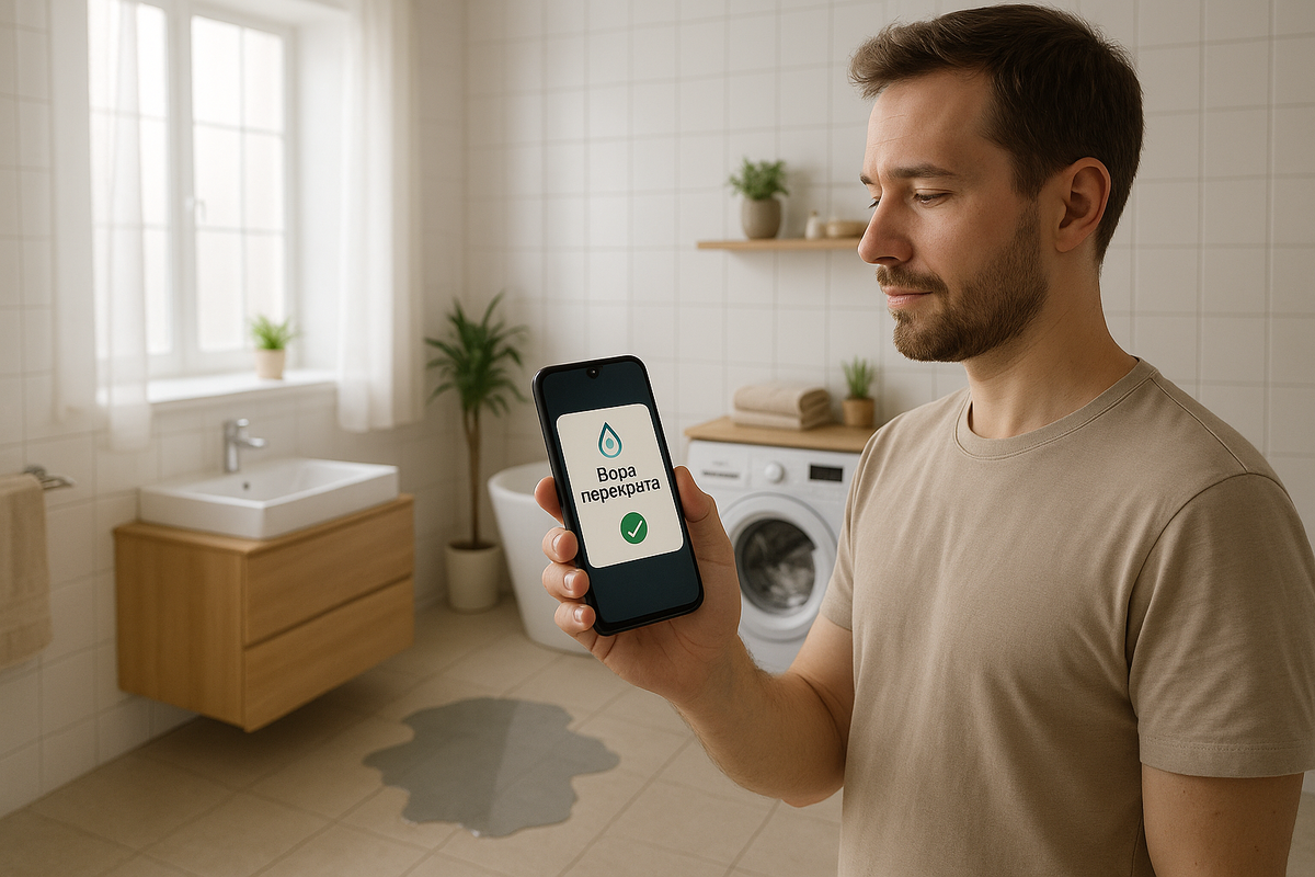 Сергей жил в панельном доме. Вечером он включил стиральную машину и ушёл в магазин. Через 15 минут система прислала уведомление: «Протечка в ванной. Вода перекрыта».