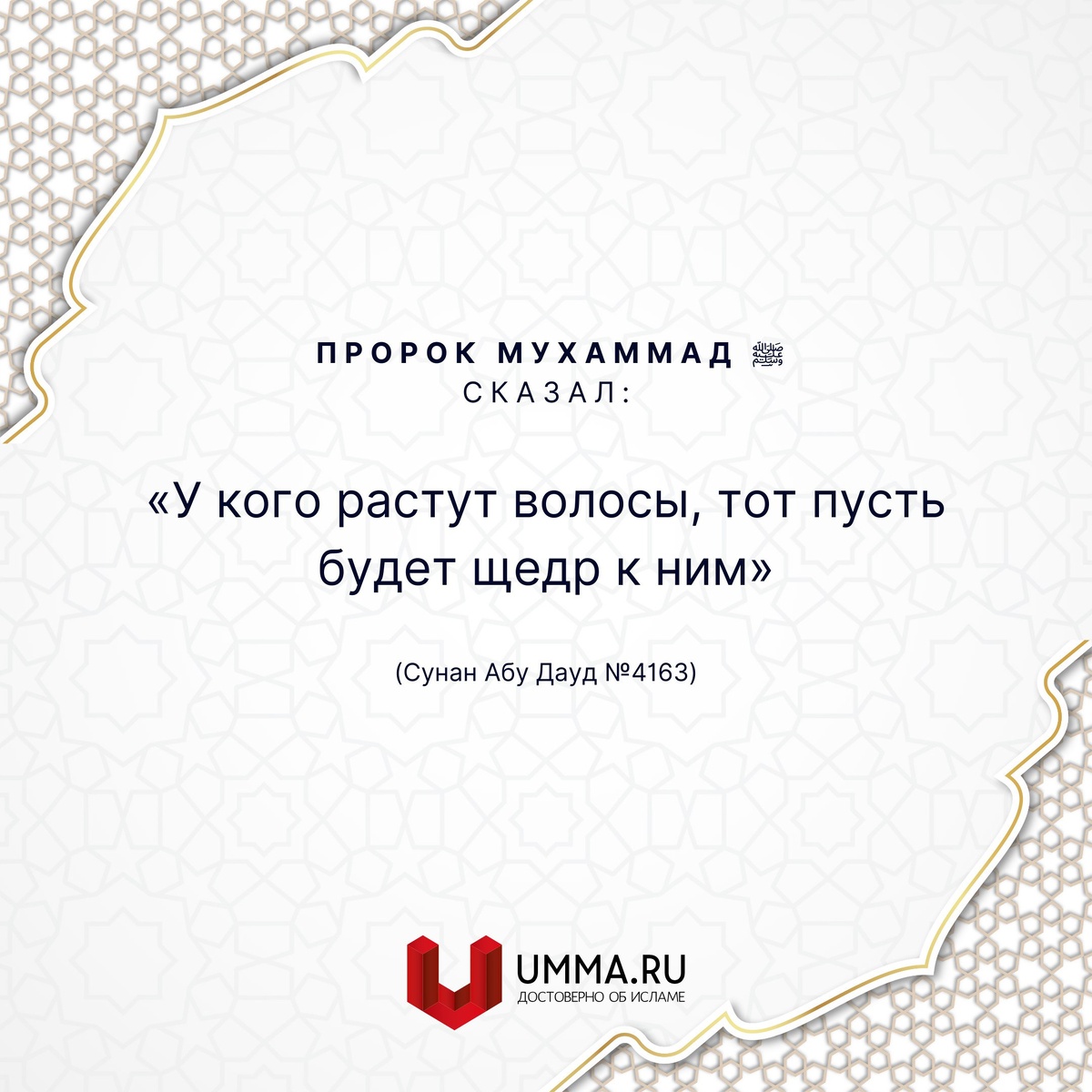 Пророк Мухаммад ﷺ сказал: «У кого растут волосы, тот пусть будет щедр к ним [ухаживает за ними]». (Сунан Абу Дауд №4163) Ухаживание подразумевает своевременное мытье, аккуратную стрижку, использование того, что укрепляет корни волос и сами волосы, а также расчесывание их и укладывание. Например, сам пророк Мухаммад ﷺ и его сподвижники для оздоровления и укладки волос использовали различные благоухающие масла.