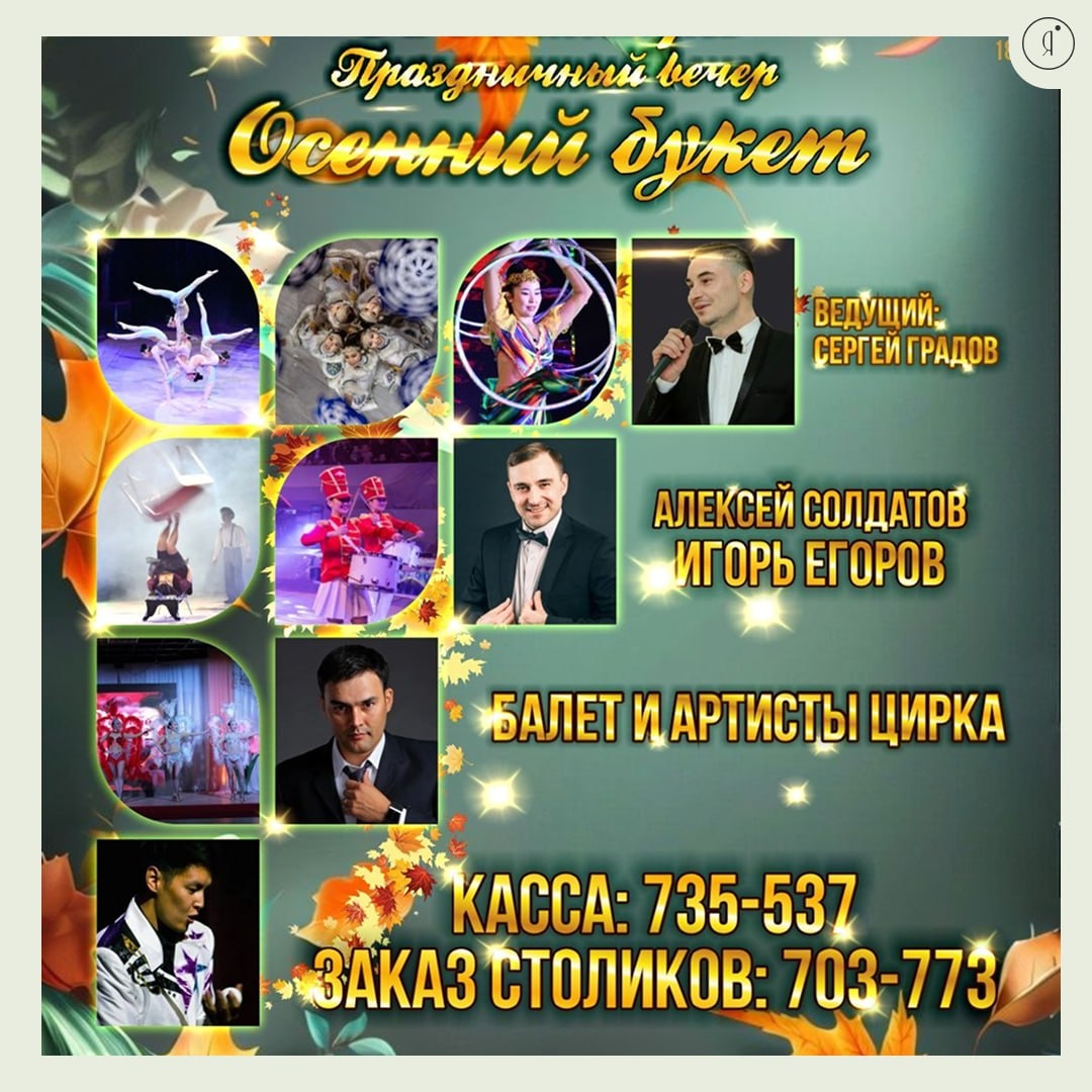 Праздничный вечер в честь Дня учителя и работника дошкольного образования «Осенний букет» #Концерты В программе: 🤩 любимые хиты Игоря Егорова и Алексея Солдатова 🤩 выступления цирковых артистов 🤩 балет и оркестр цирка 🤩 зажигательная дискотека Ведущий вечера – Сергей Градов 🌟✨Атмосфера праздника, интересная развлекательная программа, любимые песни и вкусное меню ждут вас! 3 и 4 октября | 18:00 СахаЦирк, малый зал 3000 руб. (вход + меню) +7 (914) 270-37-73 Online Якутия | Подписаться