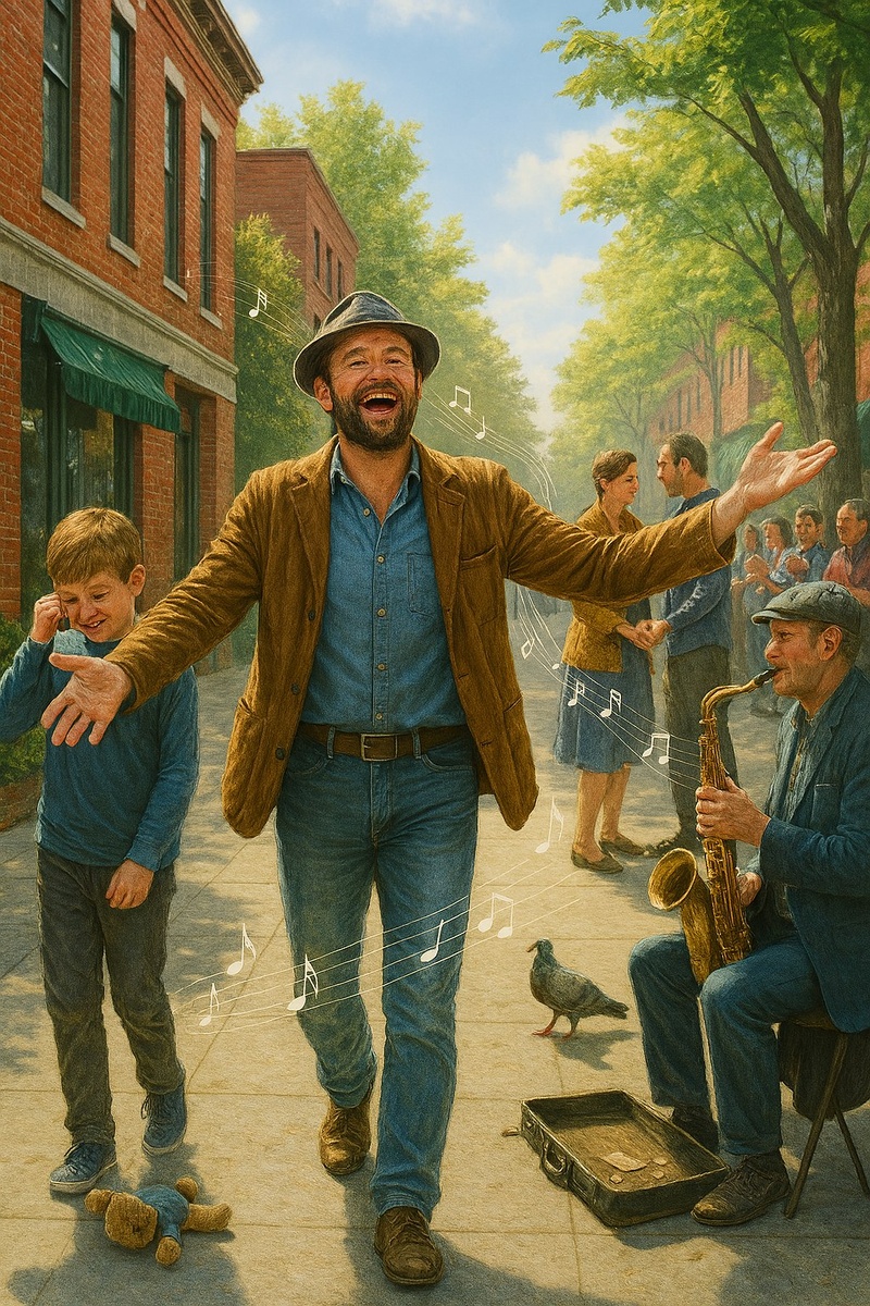 Иногда самые простые моменты становятся самыми важными. Один человек идёт по улице, поёт — и кажется, что его голос касается не только воздуха, но и сердец. Вышел я с утра, как будто праздник, Солнце светит — и внутри тепло. Напеваю что-то несуразно, Но прохожим, видно, всё равно. На углу — мальчишка, слёзы льёт он, Говорит: «Игрушку потерял...» Я ему спел строчку про котёнка — Он вдруг хмыкнул, нос утер — и встал. Дальше — пара, ссорятся у лавки, Он кричит, она в ответ — в слезах. Я прошёл, напел им пару фразок, Они замолкли, глянули — в глазах... Недоуменье, будто я с планеты Где все ходят с песней на губах. Он ей руку — она ему конфету, И пошли, смеясь, как в облаках. На углу — саксофон грустит в коробке, Дядя в кепке — музыкант без дня. Никто не слушал, только голубь топал... Но тут услышал песенку — и я... Подхватил он мой мотив на саксофоне, Зазвучало — люди стали в круг. Монеты звякнули, как в таксофоне, И я подумал: вот он, жизни