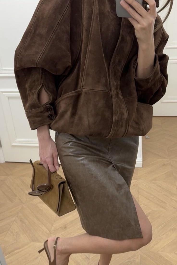 Осенний сезон 2025 года уверенно диктует новые правила стиля, где пальма первенства отдается тактильным и дорогим текстурам. В центре внимания оказывается замша — материал, который всегда в тренде осенью, становясь современным, универсальным и невероятно актуальным. Это уже не просто акцент, а основа для создания ярких и выразительных образов в этом сезоне. Трендом текущего сезона стали тотальные замшевые луки в стиле бохо. Платья и юбки миди длины с мягким силуэтом, повторяющим изгибы тела, подчеркивающие естественную красоту. Крой-футляр уступает место более свободным и плавным линиям, напоминающим о спокойной эстетике семидесятых. Рубашки и жилеты из замши выступают ключевыми элементами для наслоения. Их носят поверх воздушных блуз из шифона или тонких водолазок, создавая игру фактур. Верхняя одежда из замши — это инвестиция в образ на годы вперед. Дизайнеры предлагают отказаться от громоздких объемов в пользу приталенных тренчей и курток с акцентом на линии плеч. Акту