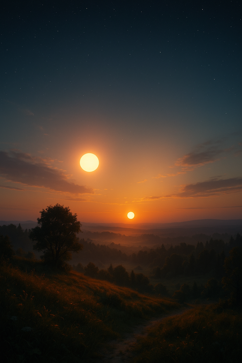В детстве я посмотрел фильм «Чёрная дыра» из серии о Риддике. Там показывали планету с несколькими солнцами, где ночь наступала раз в десятилетия. Когда светила скрывались за газовым гигантом, на поверхность вырывались твари тьмы. Это зрелище врезалось в память — и с тех пор я иногда задумываюсь: а что было бы, если бы у нашей Земли тоже оказалось несколько светил? Мы привыкли к тому, что каждое утро встаёт одно Солнце. Оно задаёт ритм нашей жизни, создаёт привычные день и ночь, влияет на климат и биосферу. Но если бы на небе горели два Солнца, мир был бы совершенно другим. В астрономии двойные звёздные системы — не редкость. Многие звёзды существуют парами, вращаясь вокруг общего центра масс. Если бы наша планета находилась в такой системе, на небе нас ожидали бы два светила. Представьте закат: одно Солнце уже ушло за горизонт, а второе ещё освещает небо. День растянулся бы, а ночь стала бы редким явлением. Два Солнца означали бы больше тепла и света. В некоторых регионах темпе
