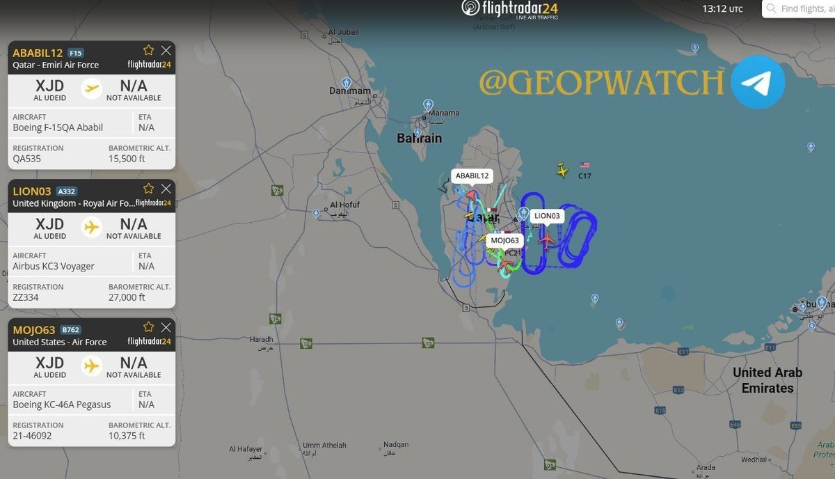 ❗️🗺Во время удара ВВС Израиля катарские истребители F-15QA с базы Эль-Удейд мирно барражировали над столицей в сопровождении британских и