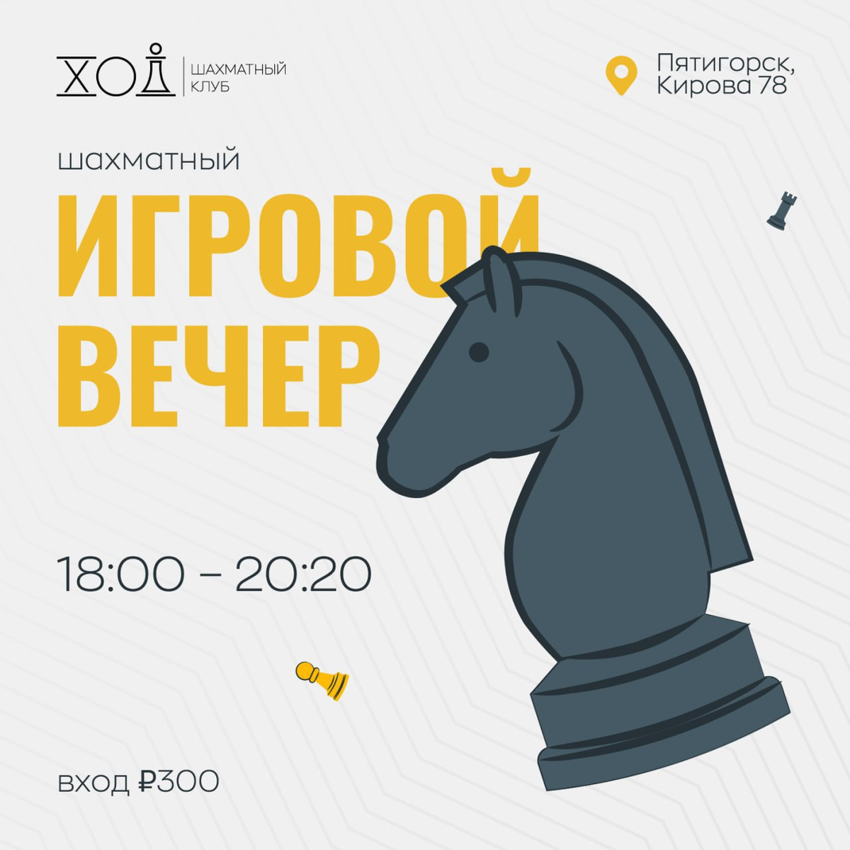 Привет, на связи Шахматный клуб «Ход»! Представьте вечер, где можно расслабиться после работы и пообщаться с интересными людьми. Неважно, когда вы последний раз держали шахматные фигуры — у нас всегда рады и новичкам, и опытным турнирным бойцам. Шахматный вечер — это: 🗓 Ждем вас сегодня 09.09 с 18:00 до 20:20 💸 Стоимость — ₽300 Для школьников, студентов и пенсионеров — скидка 50% Планируете прийти? Просто поставьте ➕ в комментариях, чтобы вдохновить других присоединиться! Остались вопросы? Пиши @epozdnkv — мы на связи! 📍 Пятигорск, проспект Кирова 78, офис 319 #шахматы_пятигорск #игровой_вечер_ход #интеллектуальный_досуг