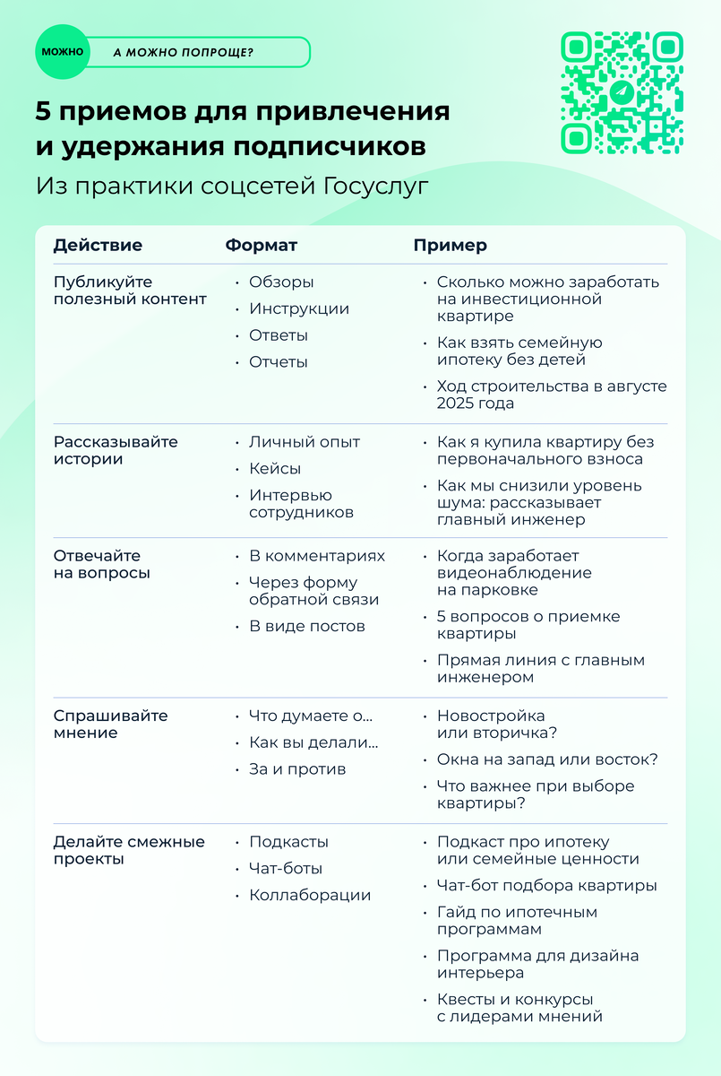 В соцсетях Госуслуг 6 млн подписчиков, которых мы бережно собирали в течение 5 лет. И хорошо знаем, что привлечь аудиторию проще, чем удержать ее интерес. Вы можете провести конкурс, запустить рекламу, сделать взаимопиар или снять трендовый рилс — и получите приток. Но если будет бесполезно и неинтересно — отписки не заставят себя ждать. За 5,5 лет работы мы изучили все методы привлечения и удержания подписчиков. Делимся пятью проверенными, которые обычно используем. Они про контент и точно работают. Примеры в чек-листе — для девелоперов и риелторов. Потому что мы сегодня выступаем для них с лекцией, которую организует офис ВКонтакте. Но это легко адаптировать для любой экспертной отрасли. Потом выложим здесь презентацию с разбором ошибок в соцсетях. А еще у нас появился канал в MAX. Подписывайтесь! @zakon_kontenta