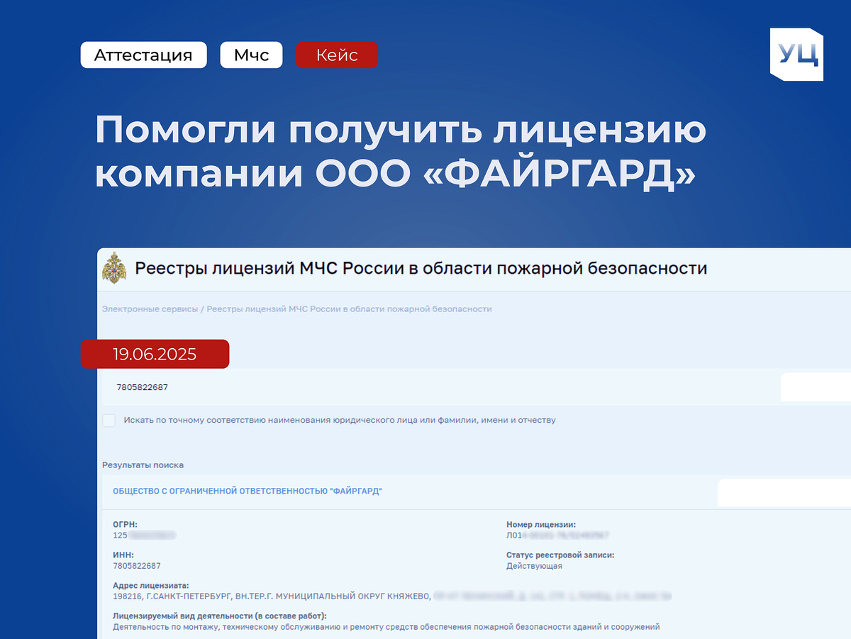 Компании ООО «Файргард» было необходимо оформить лицензию МЧС. В сжатые сроки был выполнен комплекс работ, включающий: ✔️ Проведение аудита документации на соответствие лицензионным требованиям; ✔️ Помощь в подаче заявления через портал Госуслуг; ✔️ Обучение сотрудников в соответствии с приказами МЧС и регистрацию в ФИС ФРДО; ✔️ Организацию предварительной проверки документов с лицензирующим органом; ✔️ Очное сопровождение во время визита инспектора. ❗️ВАЖНО ОТМЕТИТЬ❗️ Нарушение требований законодательства может привести не только к отказу в выдаче лицензии, но и к приостановке действующего разрешения. В отличие от недобросовестных конкурентов, которые продают лицензии, мы гарантируем прозрачность и соответствие всем нормам. Благодаря нашему сопровождению, ООО «Файргард» было внесено в реестр МЧС в течение 2 месяцев. Вы можете получить бесплатную консультацию по лицензии МЧС – оставьте заявку на сайте.