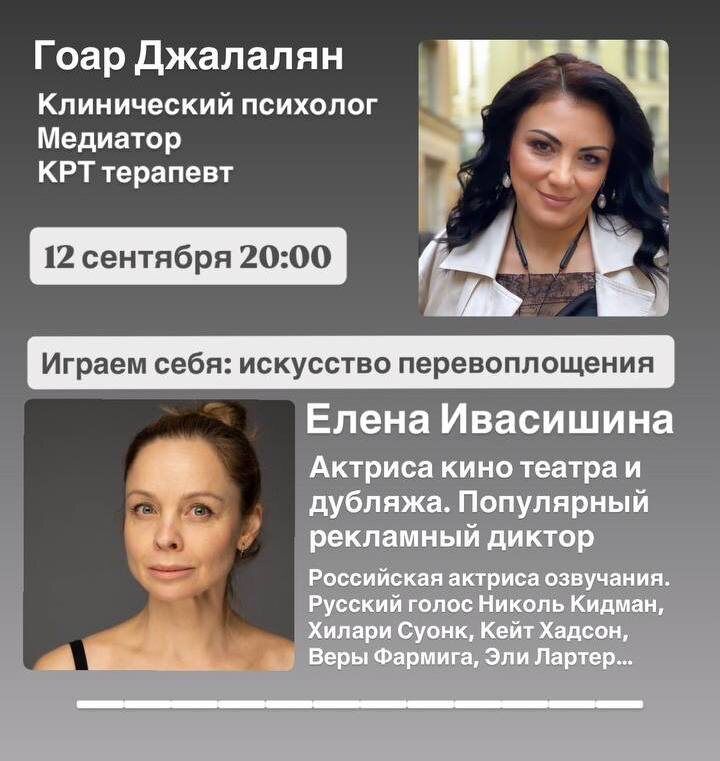 Ура! Нам с Еленой удалось найти время в наших графиках и все таки организовать для вас долгожданный эфир. У вас есть уникальная возможность познакомиться с замечательной актрисой театра и дубляжа, чьим голосом говорят Николь Кидман, Кейт Хадсон, Эли Лартер и Хилари Суонк и многое другие. А еще вы можете задать свой вопрос Елене. Не упустите уникальный шанс. Оставляйте свои вопросы под этим сообщением.