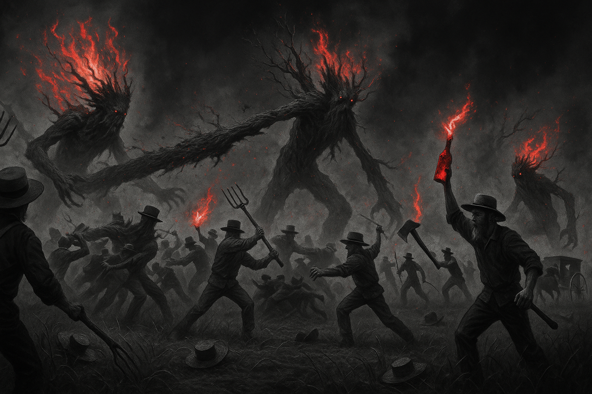 А там — битва. Амиши с инструментами дерутся с медлительными энтами. Полыхают огни. Мимо моей головы пролетает горящая бутылка с нафталином, разбивается о камень. Энт одним мощным взмахом громадной ветви валит четырёх братьев-амишей. Вдалеке гремят колесами конные повозки, как колесницы; кони ржут, ездоки машут топорами. У энтов трещит древесина, течёт смола. Люди кровоточат. Какой хаос!