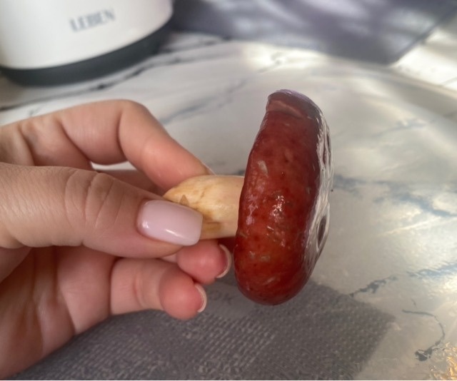 На фотографии, скорее всего, изображен гриб под названием Сыроежка винная, или Сыроежка пурпурно-коричневая, латинское название – [Russula vinosa]. Гриб имеет характерную красно-коричневую, винную окраску шляпки, которая слегка блестит и кажется влажной, что свойственно этому виду. Ножка гриба светлая, беловатая или кремовая, что также соответствует описанию Сыроежки винной. Форма шляпки, хоть и не полностью видна, кажется округлой, мясистой. Отсутствие кольца на ножке и трубчатого слоя под шляпкой (гриб выглядит пластинчатым снизу, хотя детали не видны) также указывает на принадлежность к роду Сыроежка. Сыроежка винная – это довольно крупный гриб с мясистой шляпкой диаметром от 5 до 15 см, которая изначально выпуклая, со временем становится распростертой, а в центре может быть слегка вдавленной. Цвет шляпки сильно варьируется от винно-красного, пурпурно-коричневого до темно-фиолетового, иногда с оливковым или буроватым оттенком. Кожица на шляпке часто блестящая, особенно во влажную по