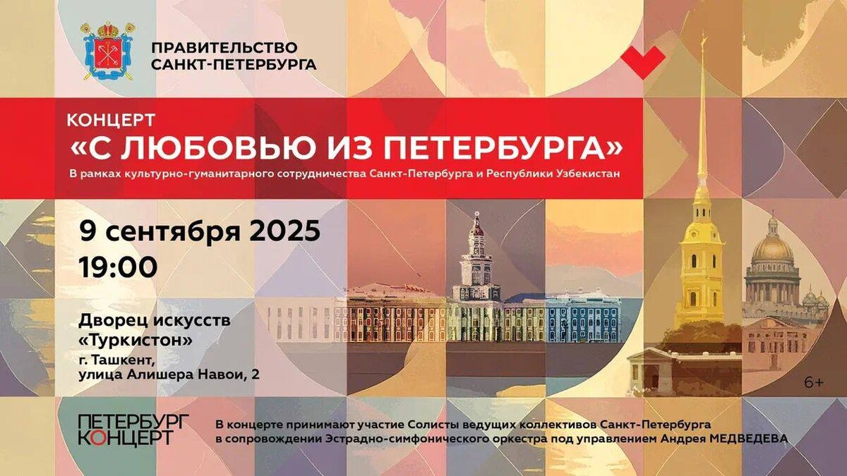 В рамках визита делегации Санкт-Петербурга во главе с Губернатором Санкт-Петербурга А.Д. Бегловым в Республику Узбекистан ведущая концертная организация северо-запада России – «Петербург-концерт» – при поддержке Комитета по культуре Санкт-Петербурга представит масштабную культурную программу! В солнечном Ташкенте во дворце искусств «Туркистон» в концертной программе «С любовью из Петербурга» выступят: «посол русской культуры» — ансамбль мастеров музыкального юмора и искрометной импровизации «БИС-КВИТ», Государственный ансамбль танца «Барыня», лауреаты российских и международных конкурсов Эдуард Хиль младший, Екатерина Лазукова и Яна Балтачева (Леонтьева), артист музыкального театра, голос аншлаговых мюзиклов Александр Саванец, звезда отечественной и мировой оперной сцены Карина Чепурнова, заслуженный артист Санкт-Петербурга, заслуженный артист Республики Саха (Якутия), выдающийся оперный и эстрадный баритон Григорий Чернецов, автор знаменитых на всю страну эстрадных шлягеров, композит
