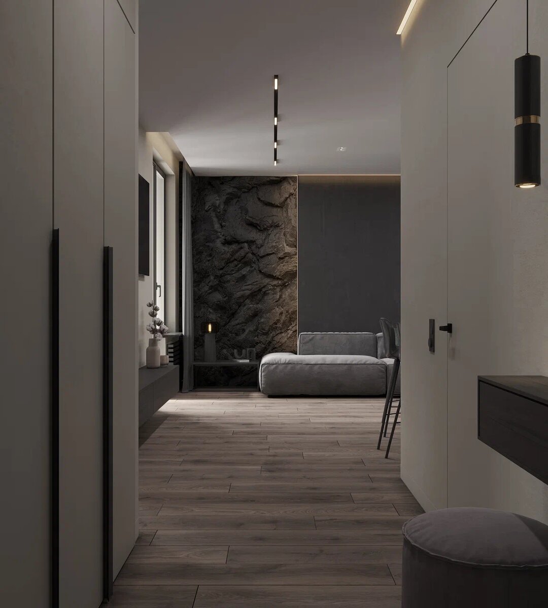 • Создали акцентную стену из камня, которая добавила интерьеру брутальности и стиля, не перегружая его • Спроектировали множество встроенных шкафов на кухне и в других зонах, чтобы пространство оставалось свободным и легким • Добавили подсветку у дивана, создав уютную и "живую" атмосферу для вечернего отдыха и приема гостей • Уделили особое внимание деталям – радиатор был подобран и интегрирован таким образом, что он абсолютно не выбивается из общей стилистики, а становится ее частью. Все светильники, выключатели и другие элементы также хорошо сочетаются с дизайном • Организовали удобную зону для приема гостей с помощью продуманного решения: мягкого дивана, функционального острова и от