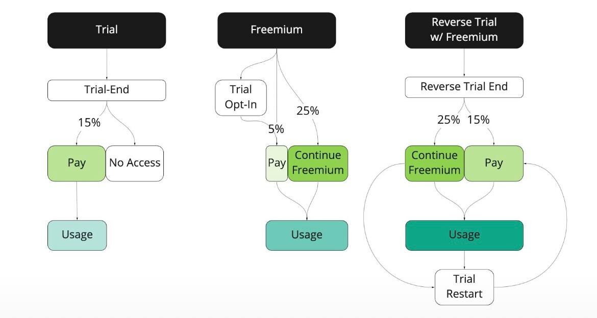 Trial vs Freemium vs Reverse Trial Классный пост от Elena Verna, разъясняющий модели монетизации. Кратко: можно не выбирать между trial или freemium, а выбрать третий путь — reverse trial, который сочетает лучшее от обоих миров. 1. Trial (пробный период) - Пользователь получает доступ ко всем функциям. - После окончания — либо платит, либо теряет продукт. Плюсы: - Хорошо конвертирует в платящих. Минусы: - Плохо развивает привычку к использованию: продукт остаётся только у платящих. 2. Freemium (бесплатная версия + апгрейд) - Лёгкий вход: можно сразу начать бесплатно. Плюсы: - Минимальное трение при регистрации. Минусы: - Трудно «дотащить» пользователя до платных фич → низкая конверсия из free в paid. 3. Reverse Trial (обратный триал) - Сразу при входе пользователь получает доступ к премиум-функциям. - Когда trial заканчивается — он не теряет продукт, а продолжает пользоваться бесплаткой. Плюсы: - Человек формирует привычку именно на платных фичах. - Можно возвращать пользоват