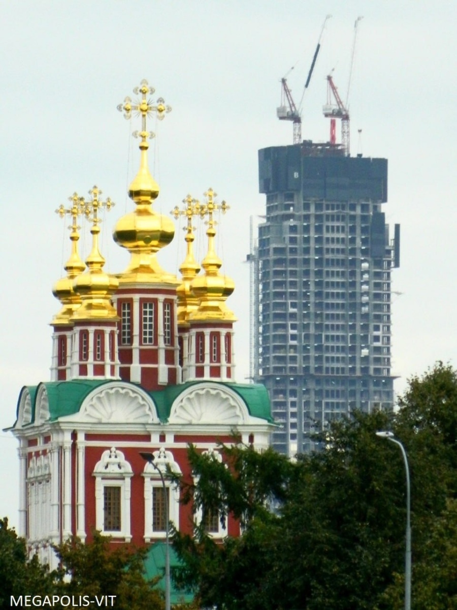 : Жилой комплекс «Five Towers». Фото и коллажи в ансамбле Новодевичьего монастыря. Съёмка от 04.09.2025 г. Без преувеличения можно сказать, что новый ЖК «Five Towers» произведёт революцию в скайлайне Москвы. И если самый удачный ракурс, откуда первый корпус выглядит запредельно высоким, открывается в районе Патриаршего моста (как идти к нему в сторону Храма Христа Спасителя по Кремлёвской набережной), то с художественной точки зрения по-настоящему уникальная композиция этого комплекса появится в сочетании с ансамблем Новодевичьего монастыря, если смотреть со стороны Бережковской набережной. Наверняка кто-то посчитает это грубым нарушением исторически сложившегося ансамбля корпусов Новодевичьего монастыря, основанного в 1524 году. Но лично я нахожу гениальным решение такой переклички, а потому сделал сразу два коллажа в соответствии с двумя точками съёмки, которые были метрах в ста друг от друга, но по одной линии набережной. В качестве основы для инфографики мне послужил рендер зас