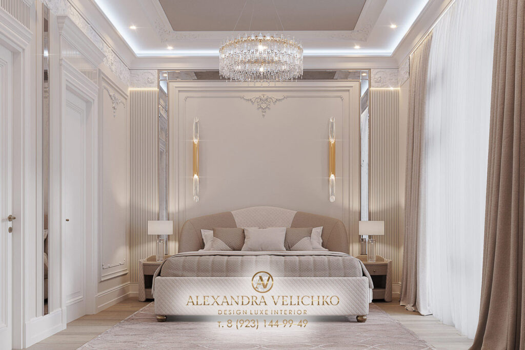 В интерьер спальни мы добавили нотки роскоши и изящества. Пространство создано по правилам классической архитектуры с соблюдением высоких канонов. За изголовьем кровати — стена с нишей, красиво обрамленная зеркалами. Она подчеркивает великолепие интерьера и создает ощущение собственной состоятельности.