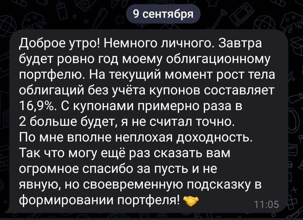 Но вообще хотел сказать, что и сам сейчас получаю удовольствие от облигационной части капитала. И еще меня радует весь полученный опыт с 2023 по 2025 в том, что касается облигаций.