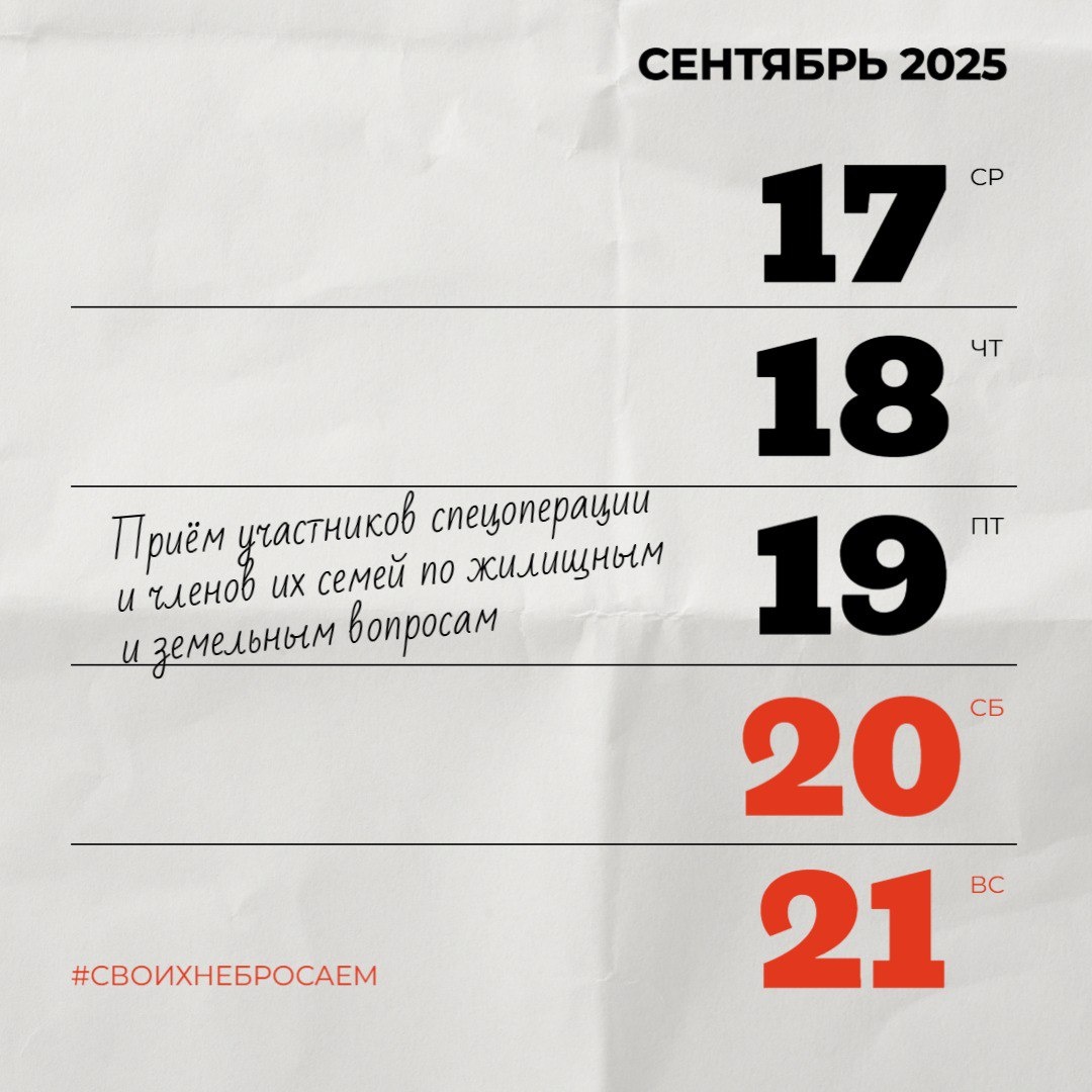 💪 19 сентября организую приём участников специальной военной операции и членов их семей по жилищным и земельным вопросам