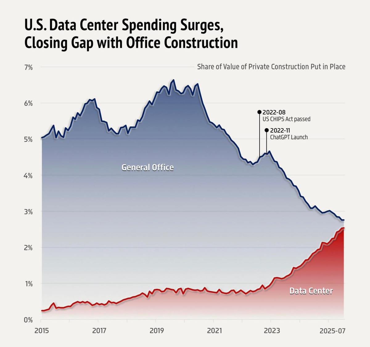 Новое золото - это дата-центры для ИИ. Новых дата-центров скоро будет строиться больше, чем офисов. Разрыв в объемах сокращается, и вскоре дата-центры обгонят офисы, тем более что количество людей, работающих в классических офисах, со временем уменьшится - благодаря автоматизации и ИИ. По данным U.S. Census, за период с июля 2022 по июль 2025 расходы на строительство дата-центров в США выросли на 224% - с $12,7 млрд до $41,2 млрд. Одновременно расходы на строительство офисных зданий сократились на 33%, с $67,1 млрд до $44,7 млрд. В результате доля дата-центров достигла 2,5% от всех расходов на частное строительство, почти сравнявшись с 2,8% на офисные здания. Если бы у нас было помещение в собственности, то свободные деньги вложили бы в ДЦ. Надо, по моим прикидкам, около 600 м2. Русский ИТ бизнес