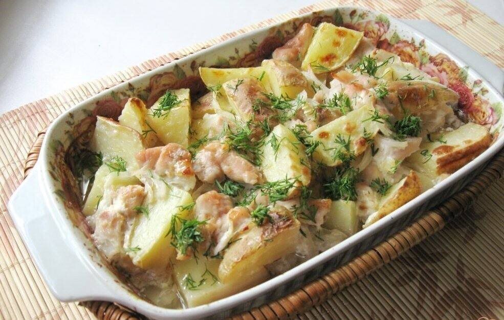 - Разогрейте духовку до 190 °C. Поставьте форму с ингредиентами в разогретую духовку и выпекайте около 40 минут до образования золотистой корочки картофеля и полной готовности мяса.