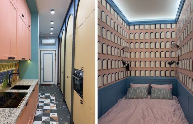 Удобная планировка и смелые решения — вам точно будет, чем вдохновиться! Эту яркую студию архитектор и дизайнер Оксана Олейник обустроила для молодой творческой девушки. Дизайнер и заказчица нашли общие интересы в любви к фильмам Уэса Андерсона и привнесли в интерьер элементы, присущие его творчеству: симметрию, повторяющиеся арочные ритмы и характерную цветовую палитру. Изначально квартира имела форму вытянутого прямоугольника и была абсолютно пустой, без каких-либо перегородок. Рядом со входом находился сантехнический стояк, что определило расположение санузла. Согласно нового плана прихожая плавно переходит в проходную кухню, у окна организована гостиная-столовая, а в нише обустроена спальня. Кухня является проходной: с одной стороны располагается рабочая поверхность с мойкой и варочной панелью. С другой стороны находится большой встроенный шкаф, часть которого служит зоной хранения для прихожей, в то время как другая часть принадлежит кухне. Остальной двухдверный шкаф предназначен