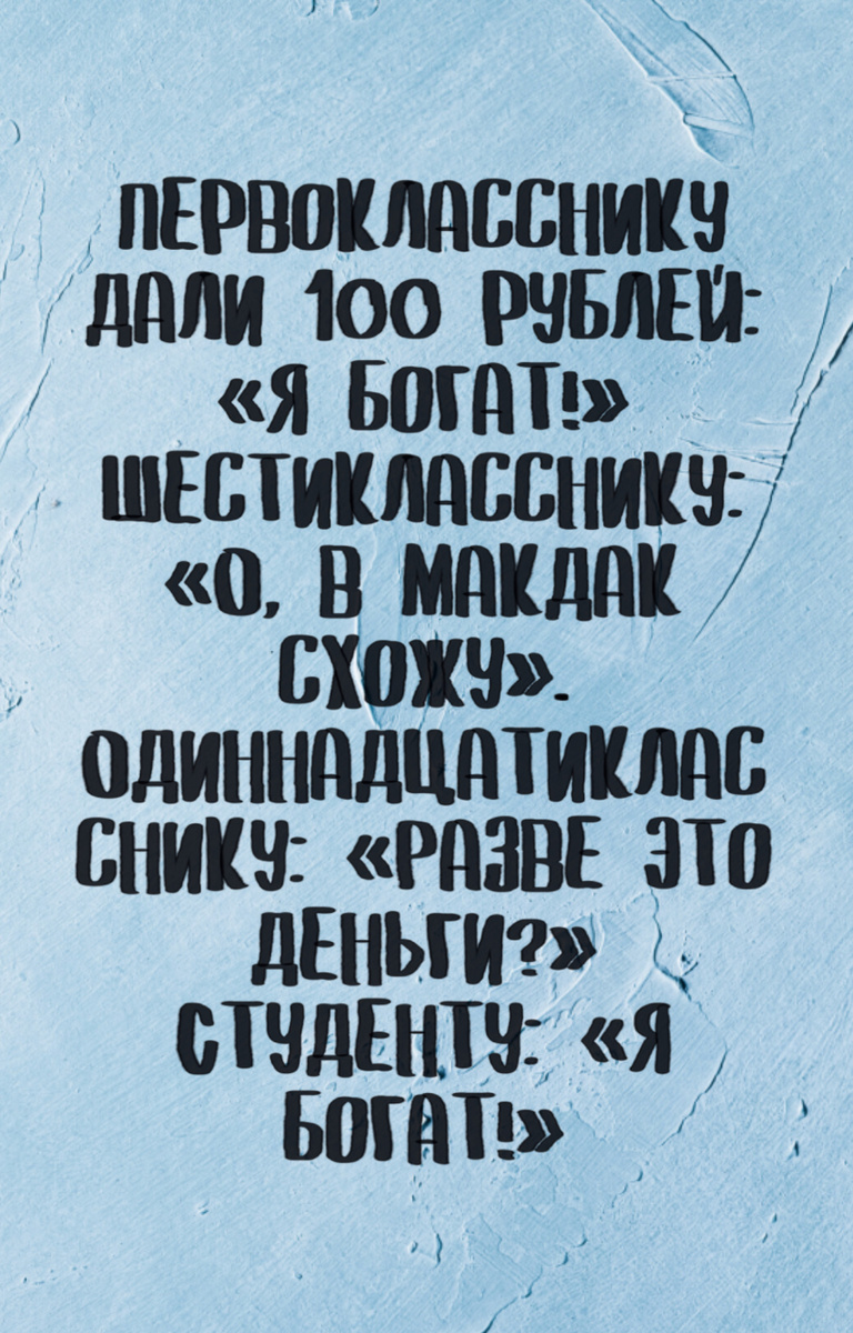 Первокласснику дали 100 рублей: «Я богат!» Шестикласснику: «О, в макдак схожу». Одиннадцатикласснику: «Разве это деньги?» Студенту: «Я богат!»