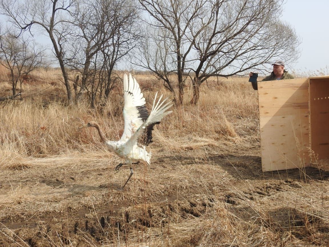 Весной этого года мы выпустили на волю самца краснокнижного японского журавля, который успешно перезимовал в нашем центре и прошел курс