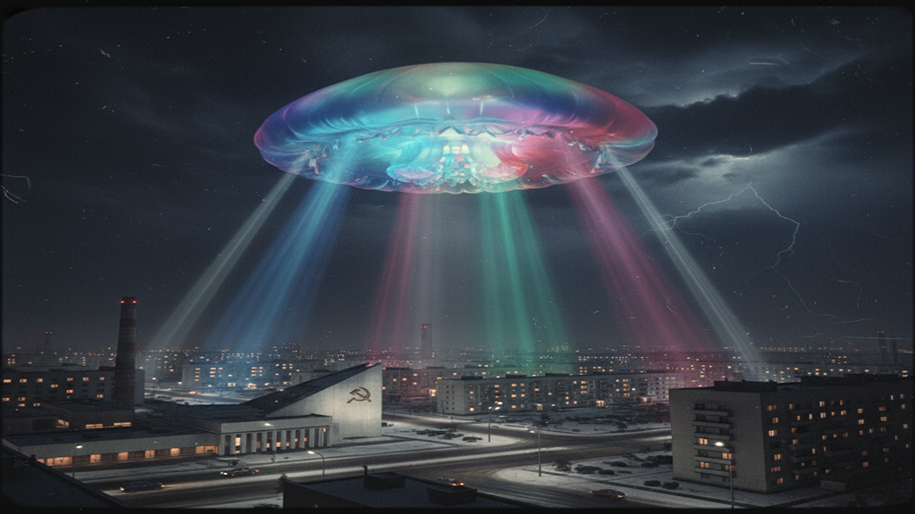 Жители Петрозаводска проснулись не от будильников, а от странного розоватого свечения, проникавшего сквозь шторы. Выглянув в окна, тысячи людей увидели картину, которая навсегда врезалась в их память: над городом медленно двигался гигантский светящийся объект, напоминающий медузу размером с футбольное поле. Его купол пульсировал мягким светом, а от краев тянулись длинные светящиеся щупальца.