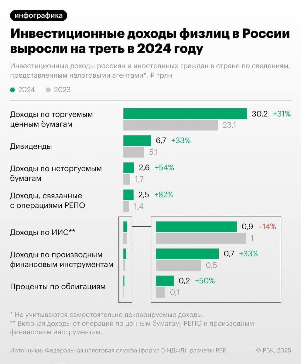 ⚡️В 2024 году доходы россиян от инвестиций увеличились более чем на треть и достигли ₽44 трлн