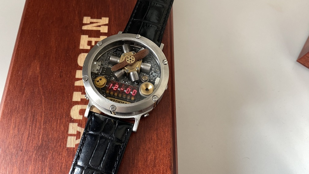 Модель Aviator от Российского бренда Neonica (часы Льва Шестакова). Необычные наручные часы в стилистике авиатор (необычные часы летчиков). Часы (идея, дизайн, корпус, индикаторы) полностью изготовлены и собранны в России. Отображение времени осуществляется советскими индикаторами 1978 года 3ЛС311/328. Корпус часов выполнен из нержавеющей стали со вставками из бронзы. Диаметр корпус 49 мм, толщина 20 мм, корпус толстый, часы весьма массивные под запястье выше среднего. Подвижный пропеллер выполнен из красного дерева. При индикации времени, пропеллер начинает вращается, создавая совершенно уникальное сочетании внешнего вида часов и отображения текущего часа. Стекло Gorilla glass (используется в iphone) защищено высоким рантом часов и максимально выгодно и надёжно для этой модели. Индикация времени не является постоянной и происходит при нажатии на кнопку с правой стороны корпуса, вход в меню происходит через нее же при пятисекундном удержании. Часы позволяют сделать настройку в ноль, вы