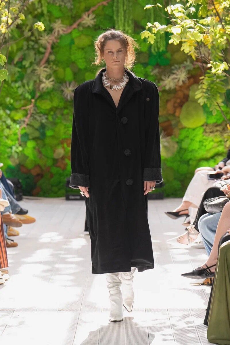 Проект Phata-Morgana (Москва) представил коллекцию на подиуме Московской недели моды Проект Phata-Morgana представил коллекцию, центральным элементом в которой стал бархат, которым был покрыт даже подиум. В линейке сочетается гранж — фактурные ткани, выразительные линии и смелые разрезы — с минималистичными формами и сдержанным кроем. В коллекцию вошли пальто оверсайз, платья прямого и А-силуэта, платья-комбинации и модели с асимметрией. Образы дополняли массивные украшения, подчеркивающие характер коллекции.