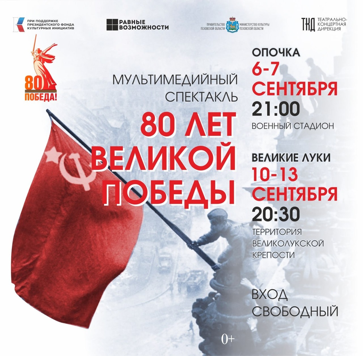В Опочке и Великих Луках пройдут показы мультимедийного спектакля «80 лет Великой Победы 🇷🇺 📍 В Опочке мероприятие состоится 6 и 7 сентября в 21:00 на территории Военного стадиона. 📍 В Великих Луках — с 10 по 13 сентября в 20:30 на территории Великолукской крепости. Мультимедийный спектакль погрузит зрителей в атмосферу Великой Отечественной войны. На экране оживет история Знамени Победы, водруженного над Рейхстагом 30 апреля 1945 года. 🎖 Спектакль рассказывает о героической борьбе с фашистами и триумфе освобождения. Центральным событием станет история штурмового флага 150-й Идрицкой дивизии. Дивизия освободила более 122 населенных пунктов, включая Идрицу, Себеж, Ригу и Клайпеду. 22 апреля 1945 года солдаты подошли к Берлину. Начались жестокие бои за Рейхстаг. День за днем они шли вперед, преодолевая сопротивление врага. 30 апреля Знамя Победы развевалось на крыше Рейхстага. Этот момент стал символом Победы 💪 Актер театра и кино Владимир Маслаков озвучивает спектакль. 🎟 В