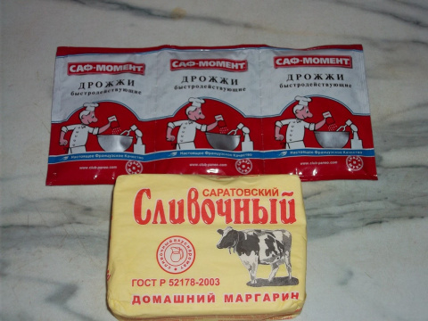 пачка маргарина(можно сливочное масло)-лучше всего маргарин "сливочный" в советской упаковке, желтенькая такая обертка, типа пергамент, если нет- можно любой маргарин для выпечки, дрожжи самые любые, главное блюсти пропорции, указанные на фантике.